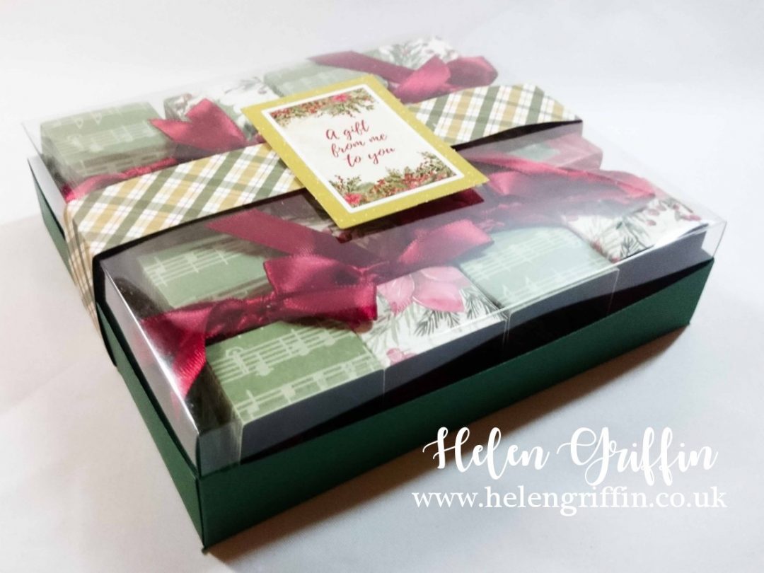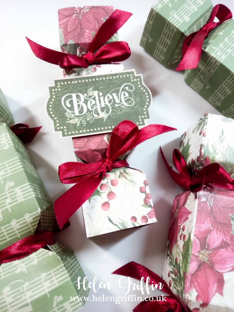 We’re starting with an easy project that I hope you will enjoy making. These little crackers hold 2 Ferrero Rochers and will look lovely at a table place setting or scattered amongst the Christmas tree branches. These would also be perfect for an advent calendar idea. With the cutting guide there is a bonus box to make to fit your crackers inside – it has an acetate lid, so the pretty crackers are visible. The card toppers from the paper pad are perfect for finishing the box.