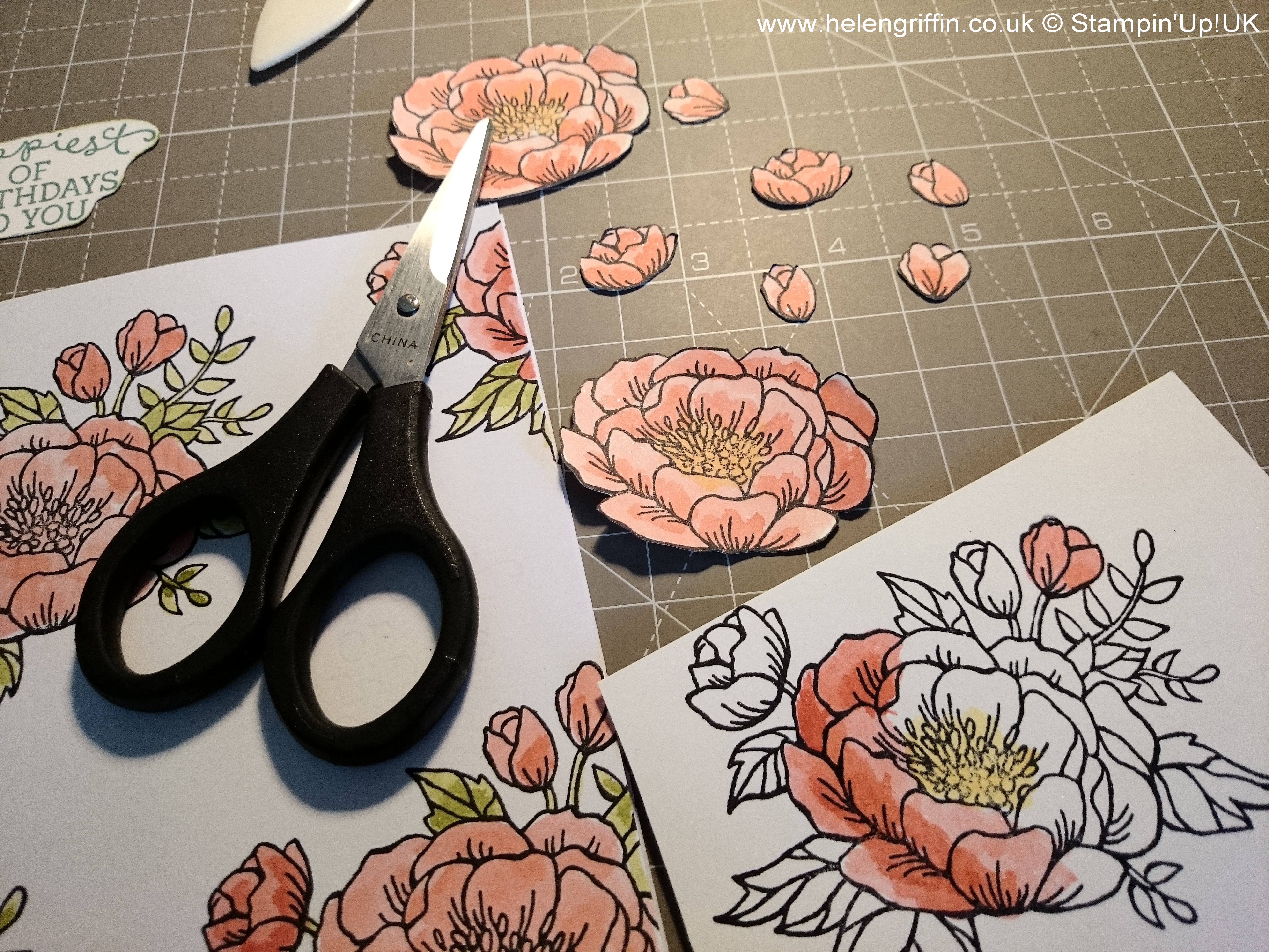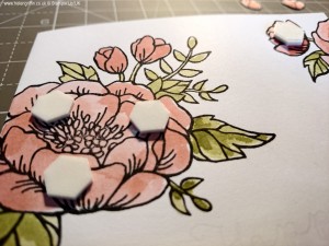 So for this card I decided to cut some of the flowers and leaves out and have them raised up on dimensionals (small foam pads).
