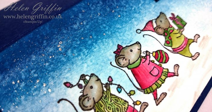 I then used Stampin’Up!’s blender pens with my ink pads (squeeze your pad and then use it as a pallet) to colour in the mice. Blender pens are perfect if you don’t have many pens for colouring. I finished the night sky with a splattering of Clear Wink of Stella – I brushed the tip of the brush against a fingernail.