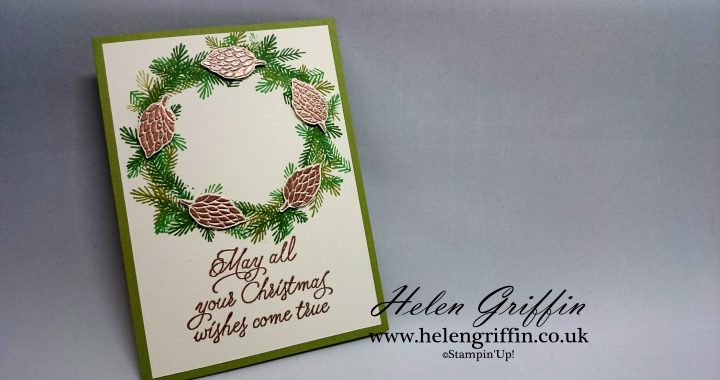This card was very easy and simple to make – all you need to start, is to draw around a drinking glass with a pencil to make your guide. Then stamp around the circle with the branch stamp in different shades of green. I then finished the card with some copper heat embossing. If you don’t want to fussy cut the pinecones, you can simply heat emboss them straight onto your card.