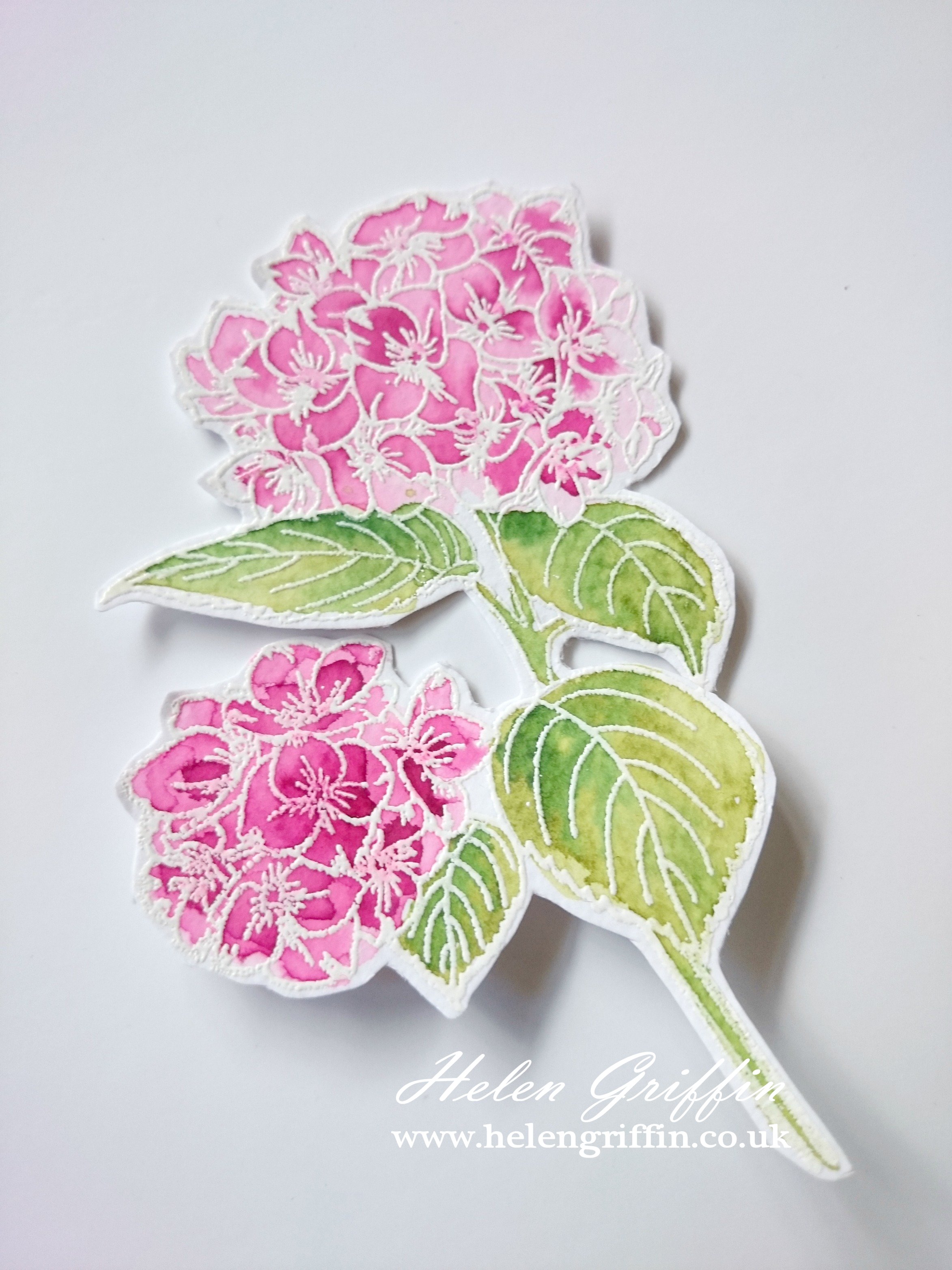 I took my inspiration from a trip to Gardeners World Live back in 2014. I went with my very good friend Jo and we both fell in love with a hydrangea called Black Diamond. It had the most amazing purple flowers and very dark green (almost black) foliage and stems. I kept the green quite normal for my card, but the Black Diamond Hydrangea will be featured again soon, with all the dark foliage!